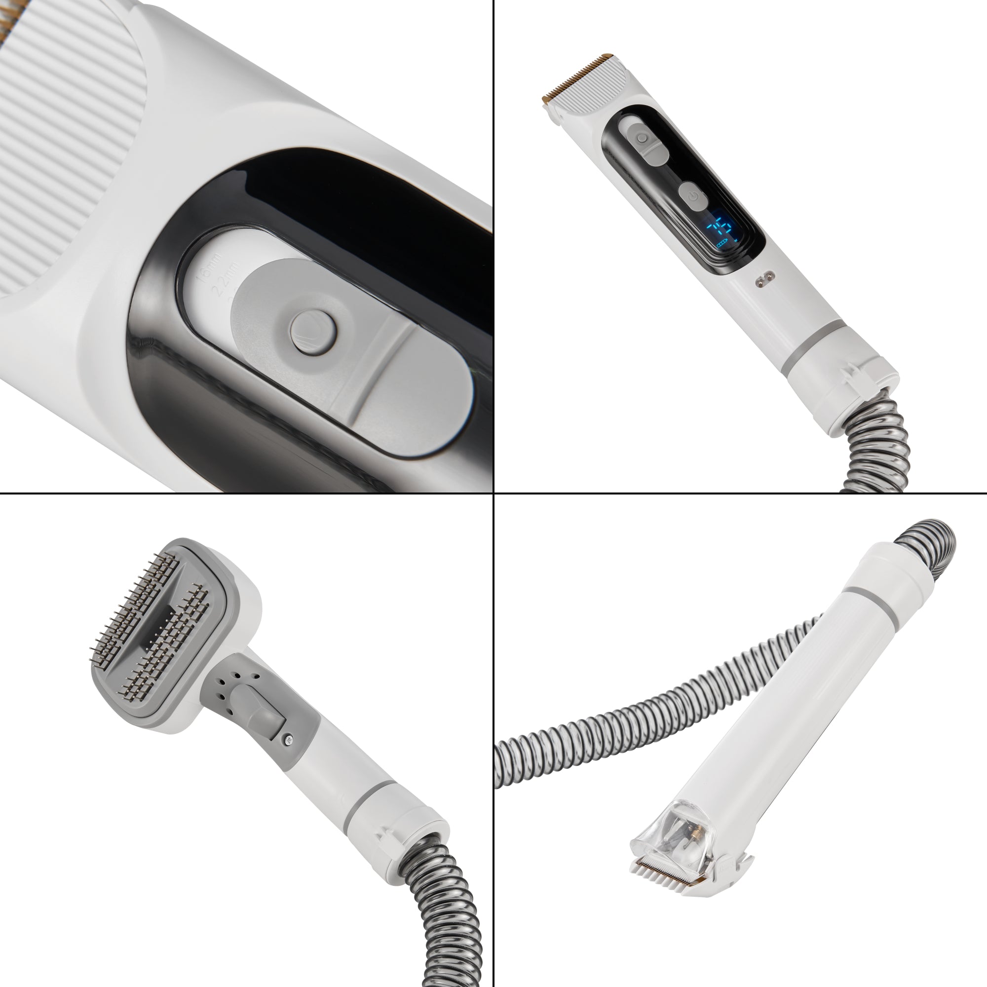 Este dispositivo multifuncional combina la precisión de una máquina de cortar pelo profesional con la eficiencia de una potente aspiradora. La máquina eléctrica le permite recortar el pelaje de su mascota sin esfuerzo, mientras que la aspiradora se encarga de recoger el pelo cortado inmediatamente, manteniendo su hogar limpio. Los diferentes peines guía garantizan resultados perfectos para cada longitud de pelaje.