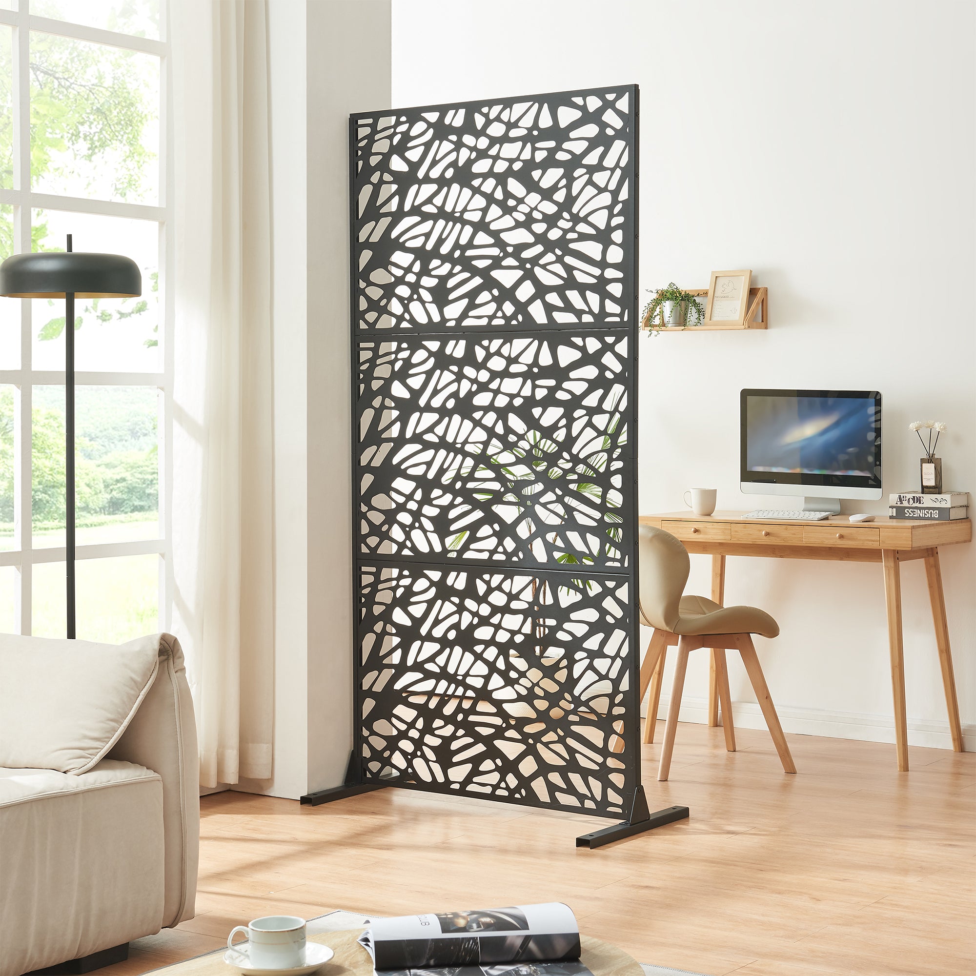 El biombo está fabricado con metal de alta calidad con cortes precisos que generan un atractivo juego de luces y sombras. Es ideal para diseñar ambientes modernos de vivienda y trabajo.