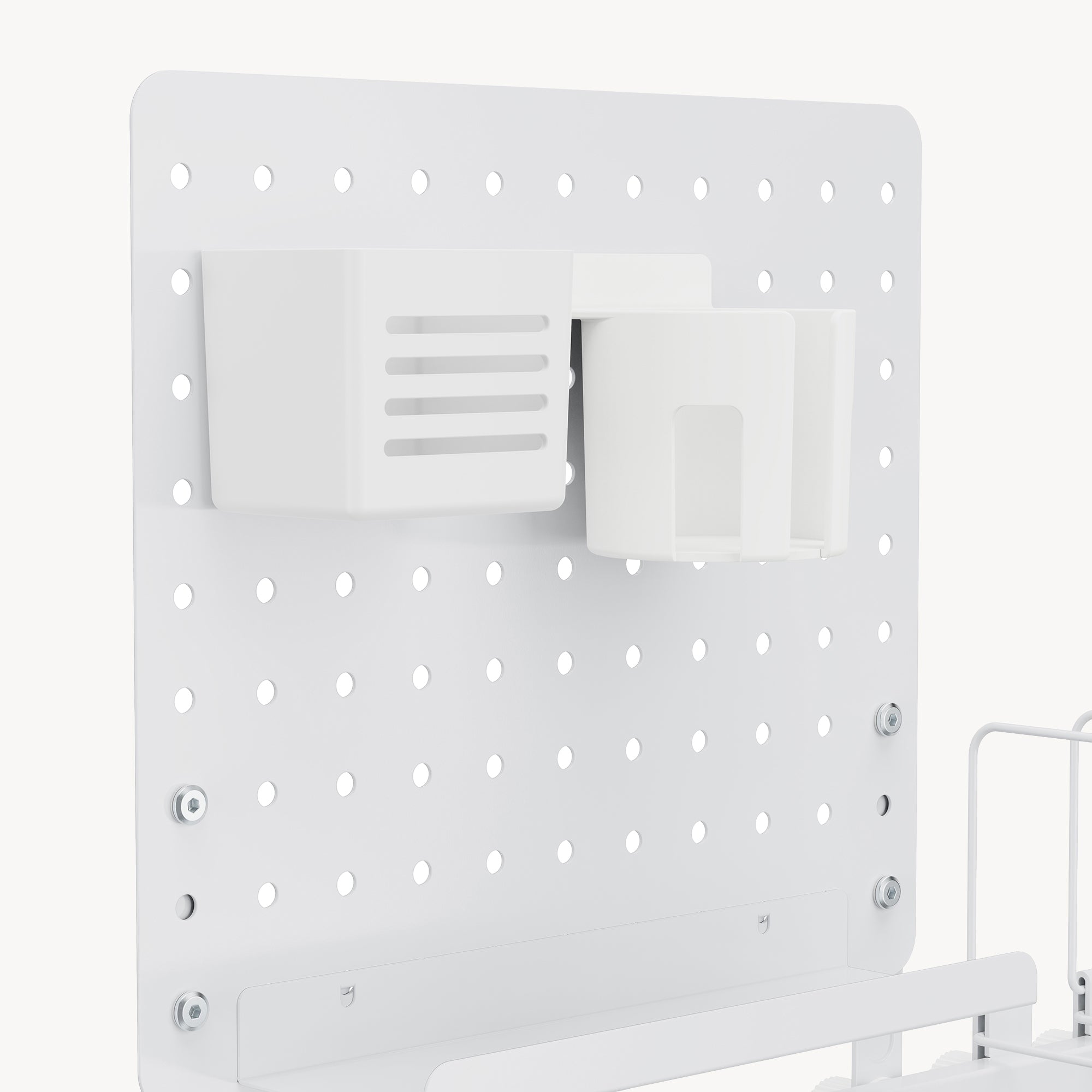 La pared perforada ofrece numerosas posibilidades para una organización individual. El portabolígrafos, el portavasos y la bandeja con borde elevado incluidos se pueden colocar libremente, justo donde los necesite en el día a día.