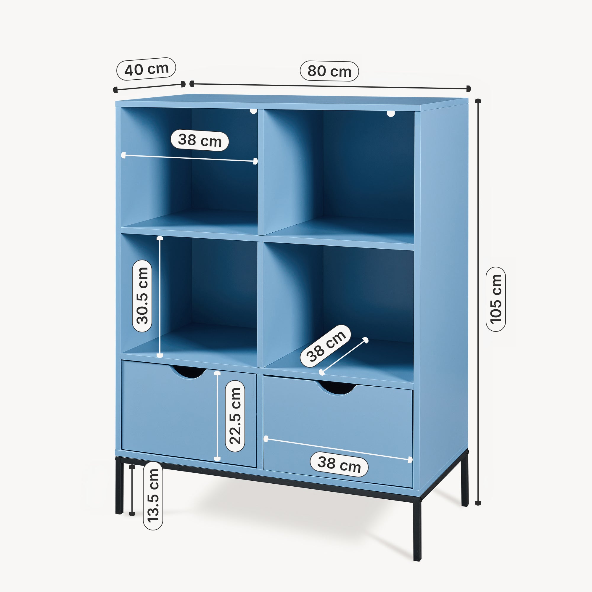 Die vier offenen Fächer schaffen übersichtliche Ablageflächen für Bücher, Deko und Pflanzen, während die zwei Schubladen Zubehör, Dokumente oder Kabel ordentlich verstauen. So haben Sie Ihre Lieblingsstücke schnell zur Hand und erzeugen ein stimmiges Gesamtbild.