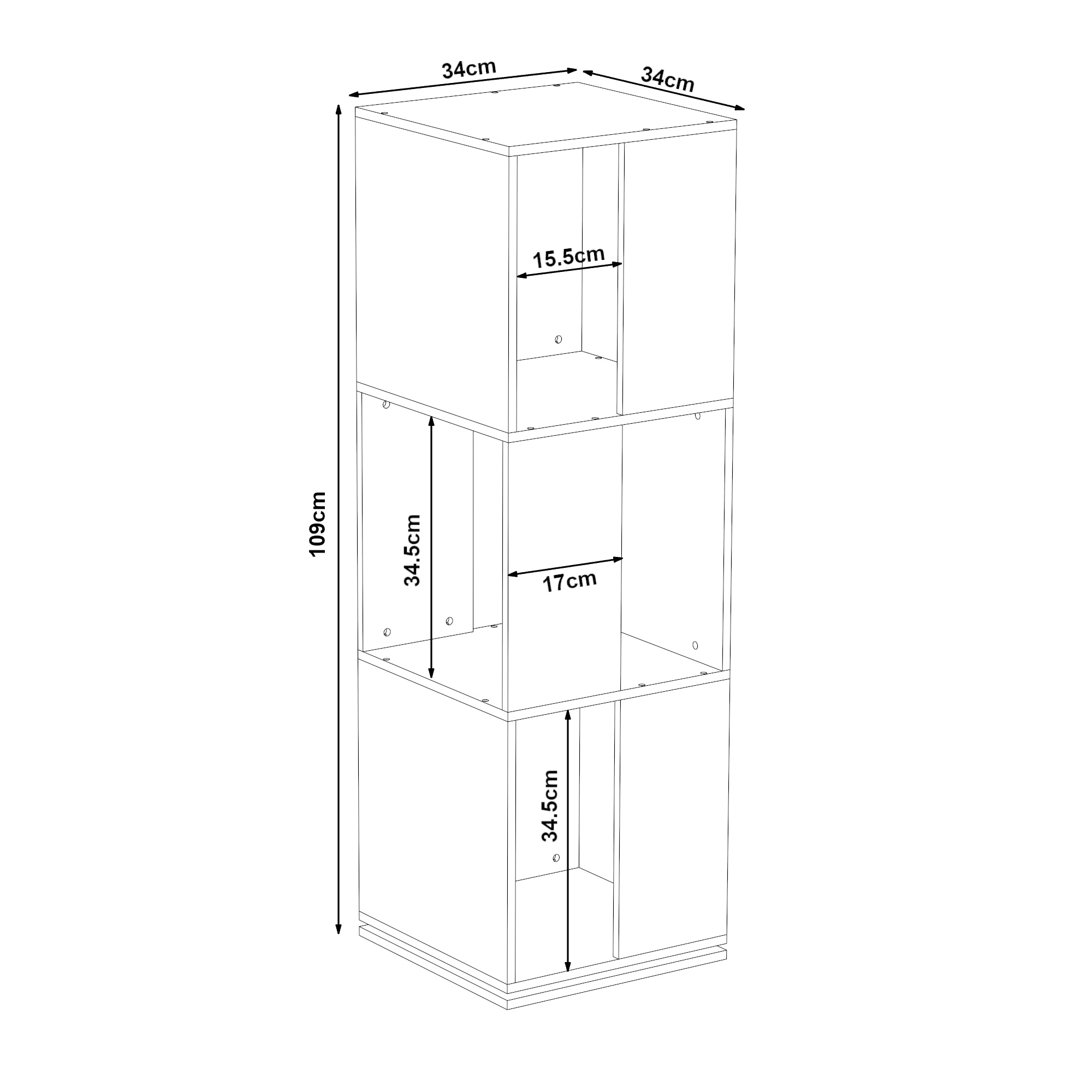 La estantería giratoria para niños cuenta con tres amplios compartimentos abiertos que ofrecen suficiente espacio para libros, juguetes o decoración. Los laterales semicerrados le confieren un aspecto elegante y armonioso.