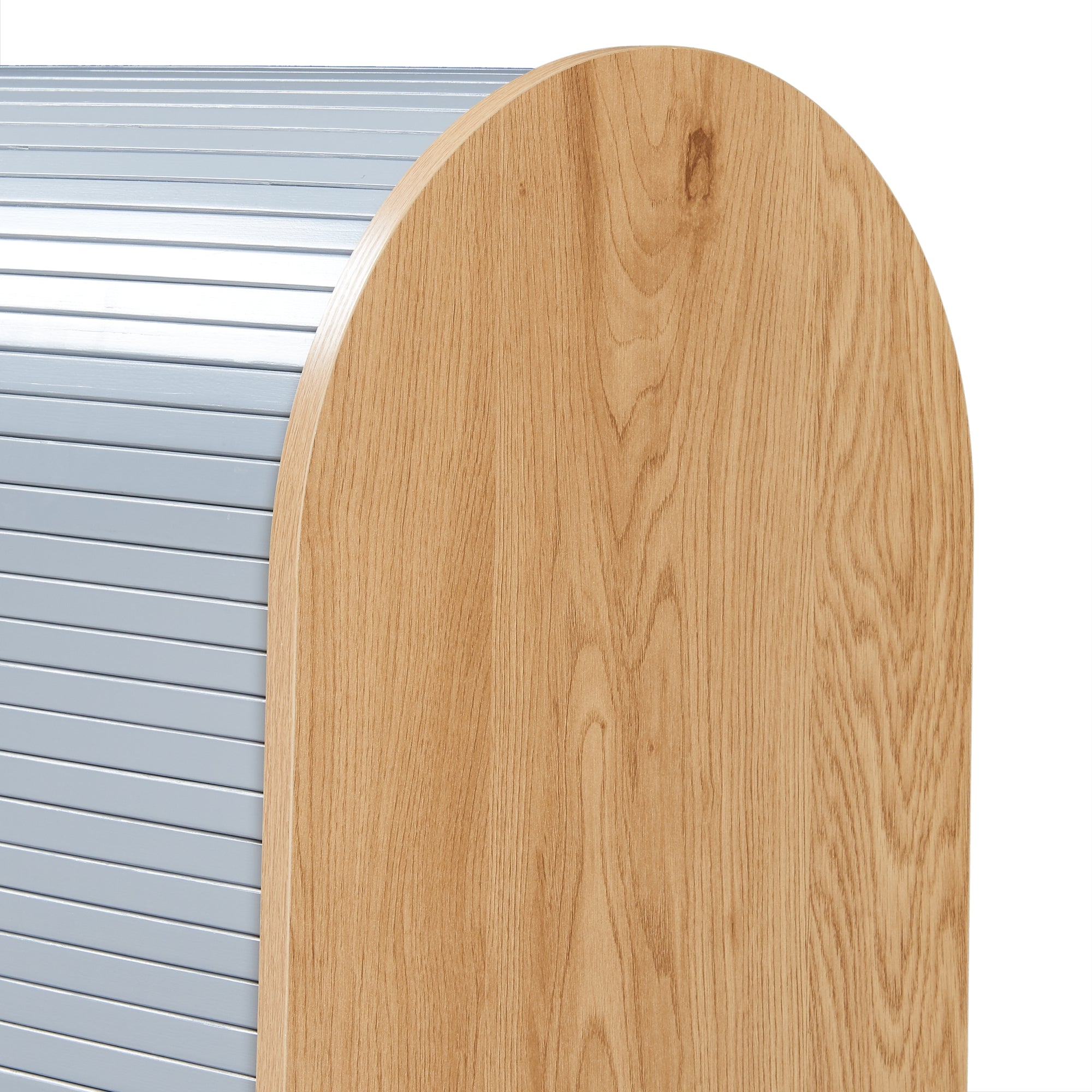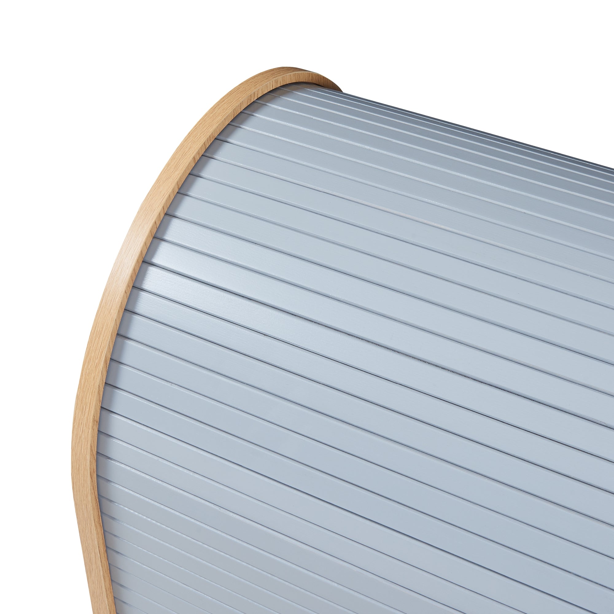 La puerta de persiana enrollable, de fácil manejo, se desliza hacia arriba sin esfuerzo y sin ocupar espacio adicional. Por ello, el armario es perfectamente utilizable también en habitaciones pequeñas o rincones estrechos.