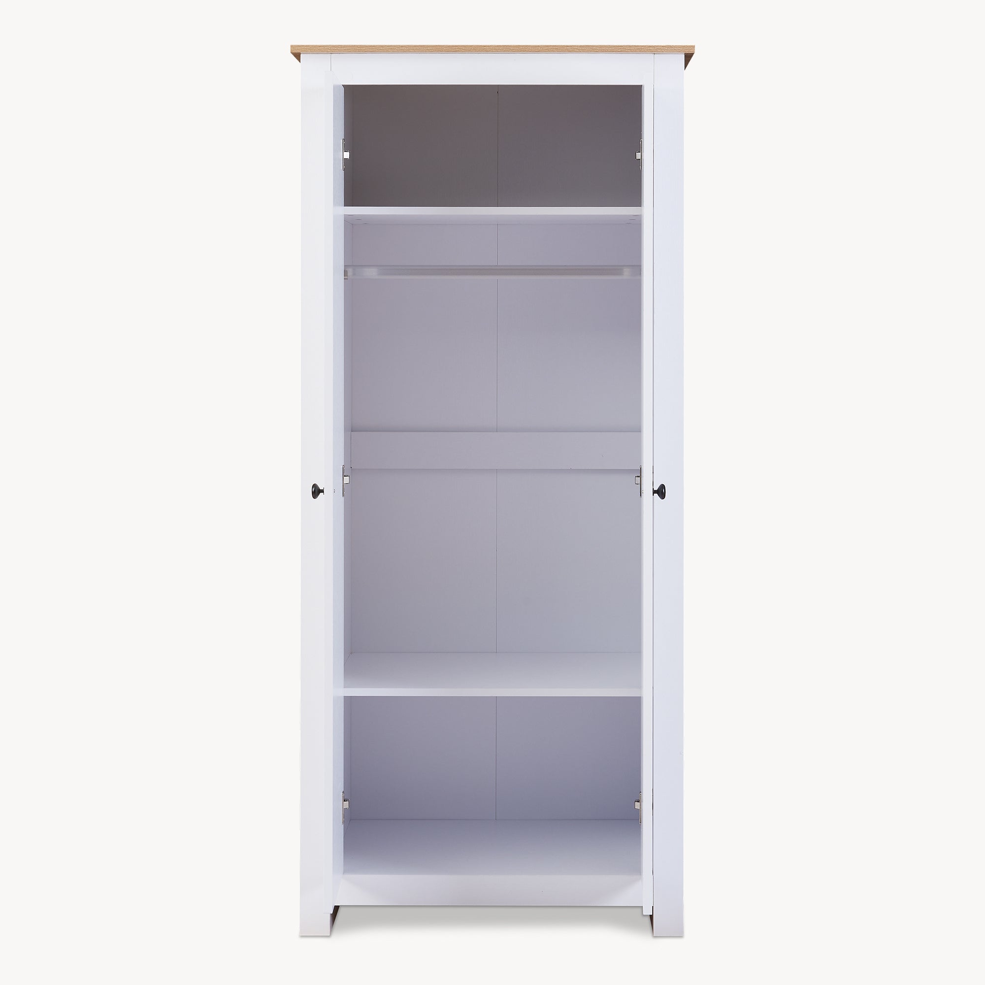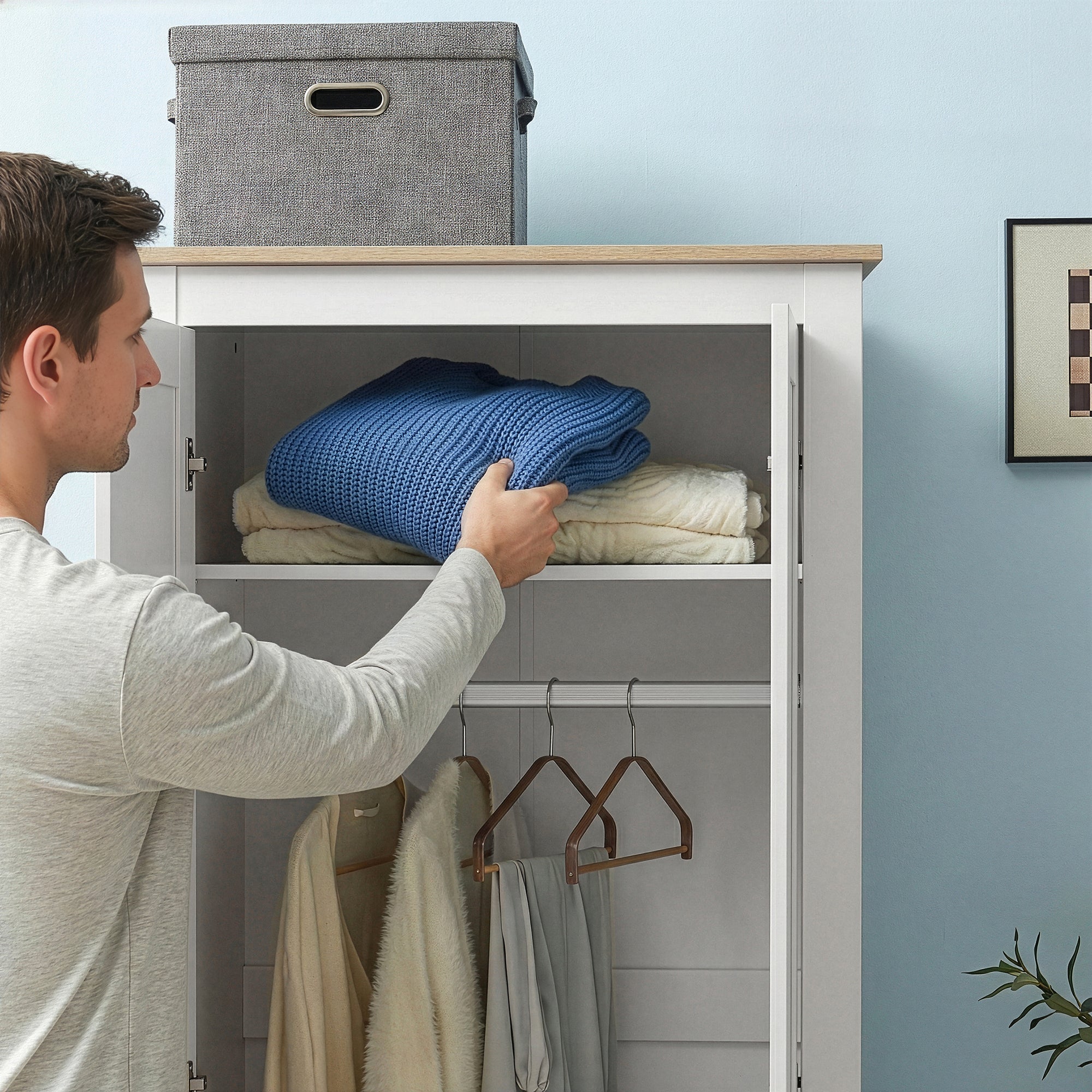 En el interior del armario encontrará un amplio espacio para colgar con barra para ropa, que organiza su vestimenta de manera clara. Además, dispone de un espacioso compartimento superior y otro inferior para un almacenamiento ordenado.