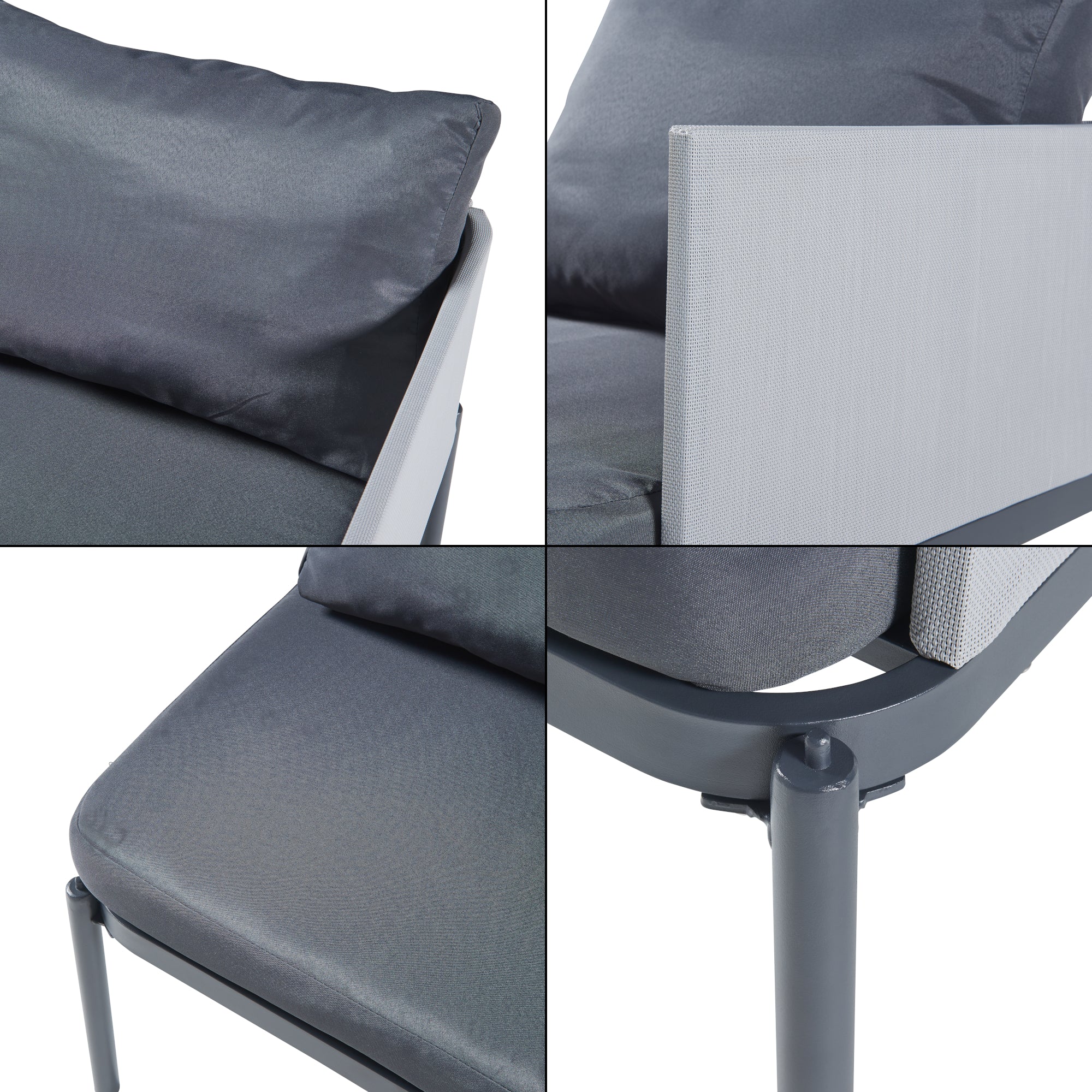 Las sillas están equipadas con cojines acolchados cómodos que proporcionan mayor confort. La mesa cuadrada es ideal para colocar bebidas, aperitivos y otros objetos. Gracias a los reposabrazos en un solo lado, las sillas pueden juntarse de forma flexible para crear una mayor superficie de asiento o un sofá cómodo.