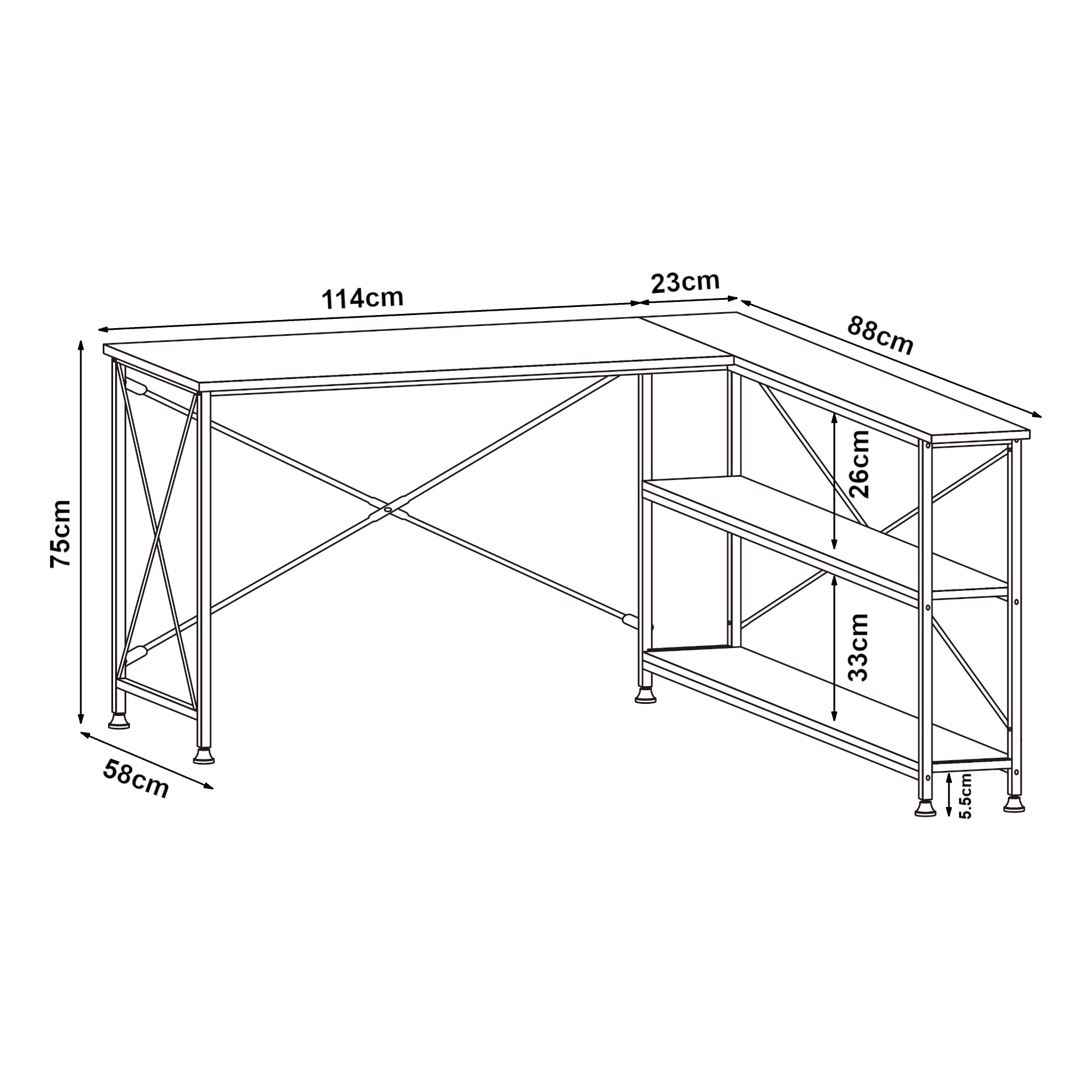 El escritorio en forma de L cuenta con una estantería integrada con dos compartimentos abiertos, que se pueden montar opcionalmente a la izquierda o a la derecha. Los compartimentos ofrecen amplio espacio de almacenamiento para libros, documentos, material de oficina y objetos decorativos, de modo que todo tenga su lugar y esté al alcance.