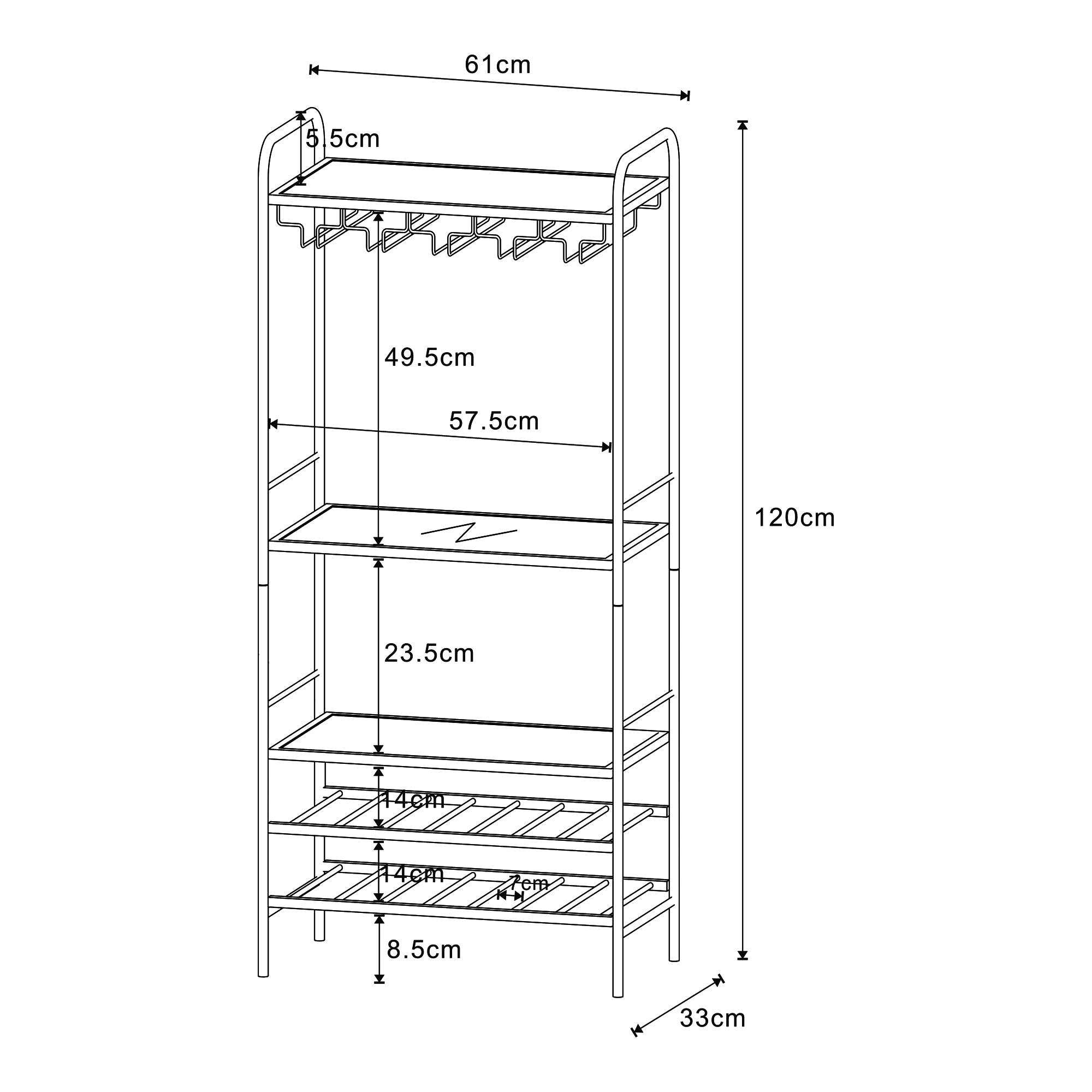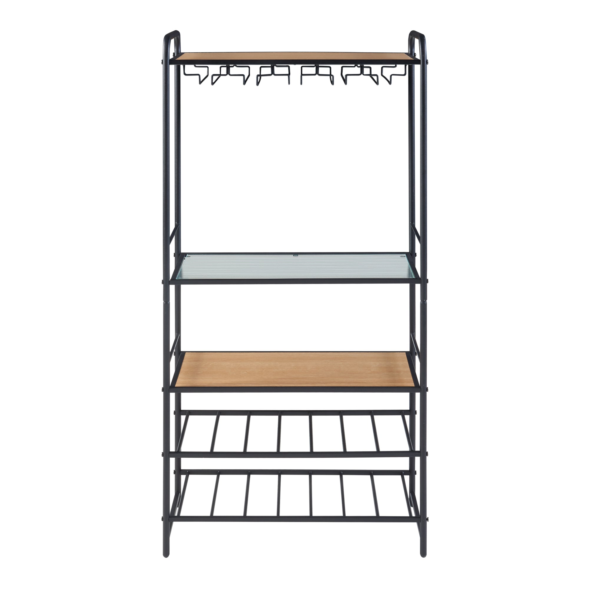Con tres amplias superficies de almacenamiento, ofrece espacio suficiente para copas o sus decoraciones favoritas, mientras que las dos repisas de rejilla están diseñadas específicamente para botellas de vino. La repisa superior cuenta con un práctico soporte para copas que brinda comodidad adicional.