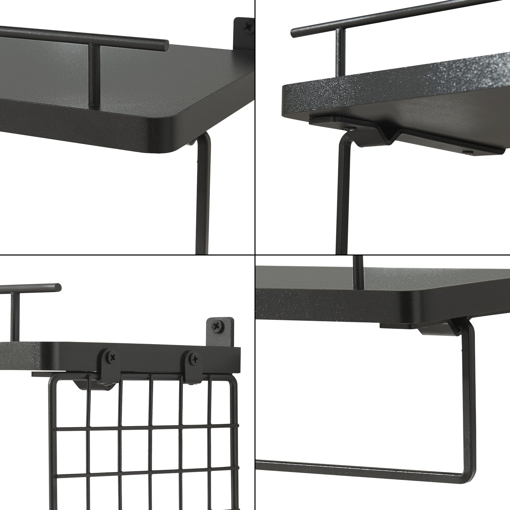 La primera estantería destaca por una superficie superior de almacenamiento y un compartimento abierto con un diseño moderno de rejilla, que ofrece una solución práctica y elegante para guardar sus objetos. La segunda estantería cuenta con un soporte integrado para toallas, que permite una organización que ahorra espacio. Ambas superficies de almacenamiento están equipadas con un pequeño borde frontal discreto que evita de forma fiable la caída de objetos pequeños.