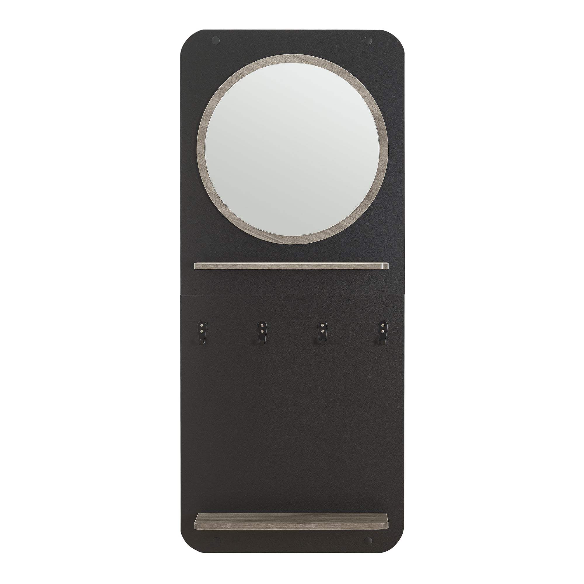 Un espejo integrado completa el diseño y permite un último vistazo a su atuendo antes de salir de casa. El espejo es redondo y armoniza perfectamente con el resto de los elementos del guardarropa.