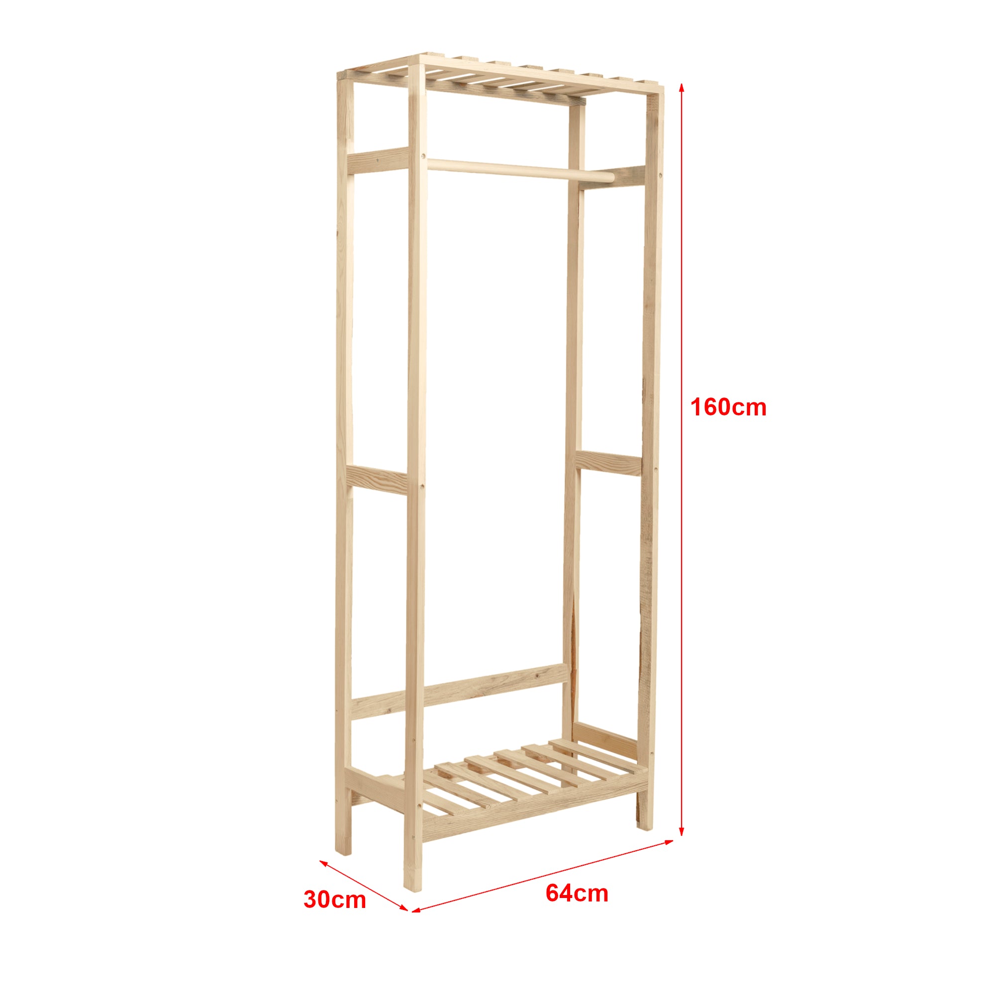 El práctico y estable perchero de madera natural de pino se monta rápida y fácilmente. Cuenta con una barra para colgar ropa y le permite tener siempre a mano sus prendas favoritas. La repisa inferior es ideal, por ejemplo, para sus zapatos, mientras que la superior puede servir como soporte para sombreros.