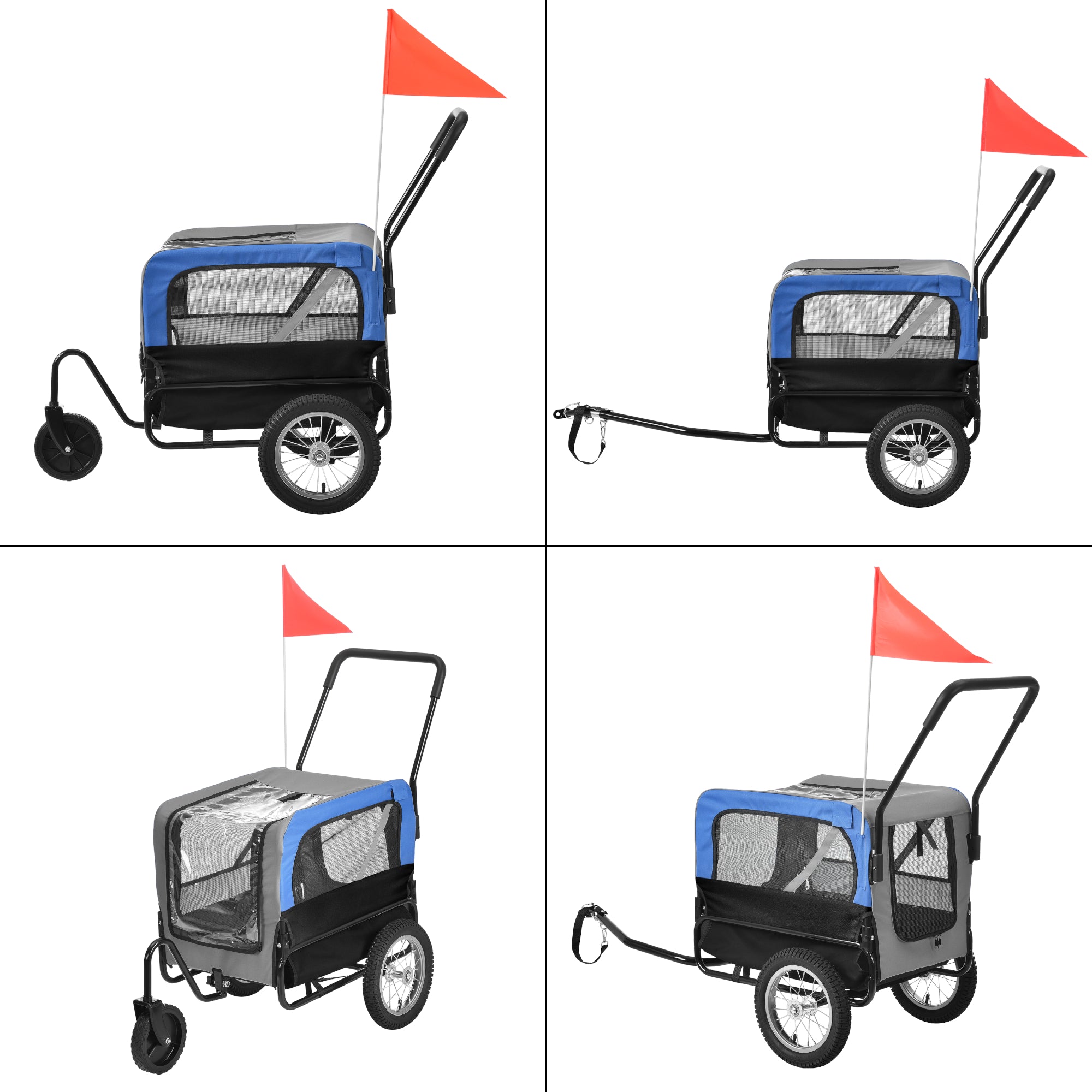 El práctico remolque es ideal para llevar perros pequeños o transportar objetos. Según sea necesario, se puede montar el enganche para bicicleta incluido en el paquete o la rueda delantera suministrada para empujar el remolque como un cochecito.