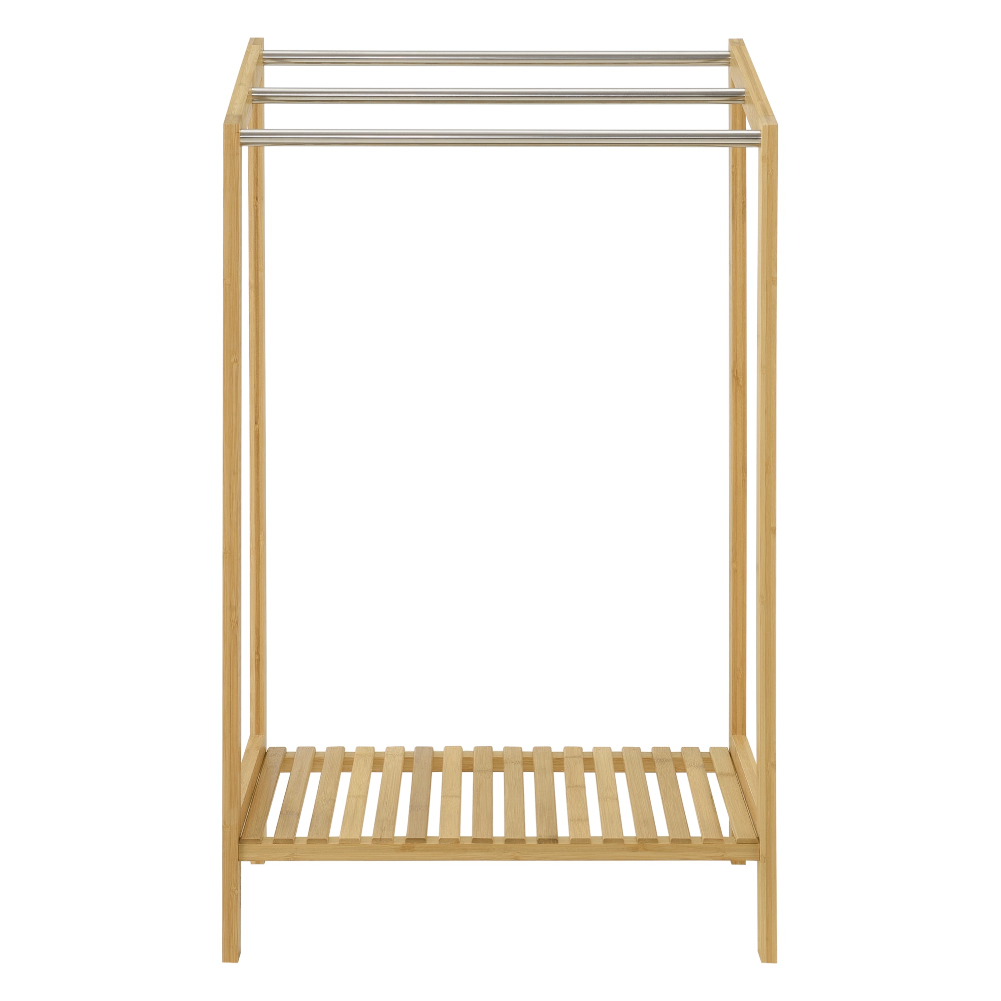 El toallero de pie ofrece la manera ideal de colgar sus toallas o ropa de baño para que se sequen fácilmente. Cuenta con 3 barras para toallas situadas a diferentes alturas. Además, en la repisa inferior se pueden colocar chanclas o toallas limpias.