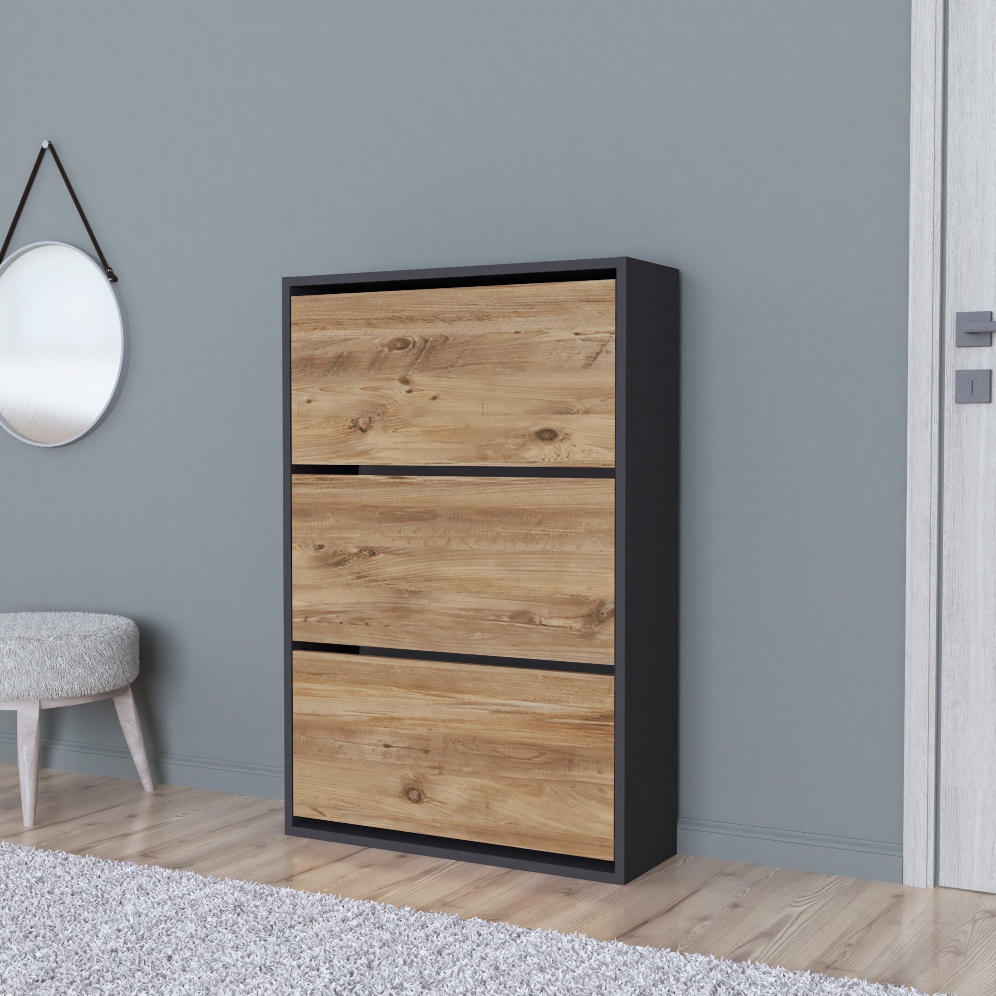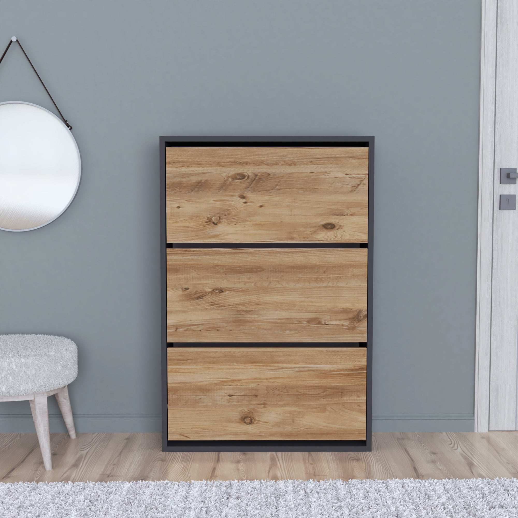 El moderno zapatero abatible cuenta con tres puertas abatibles y le ofrece la solución ideal para almacenar sus zapatos de forma que ahorre espacio. Con su diseño atractivo, se convierte en el centro de atención en cualquier habitación.